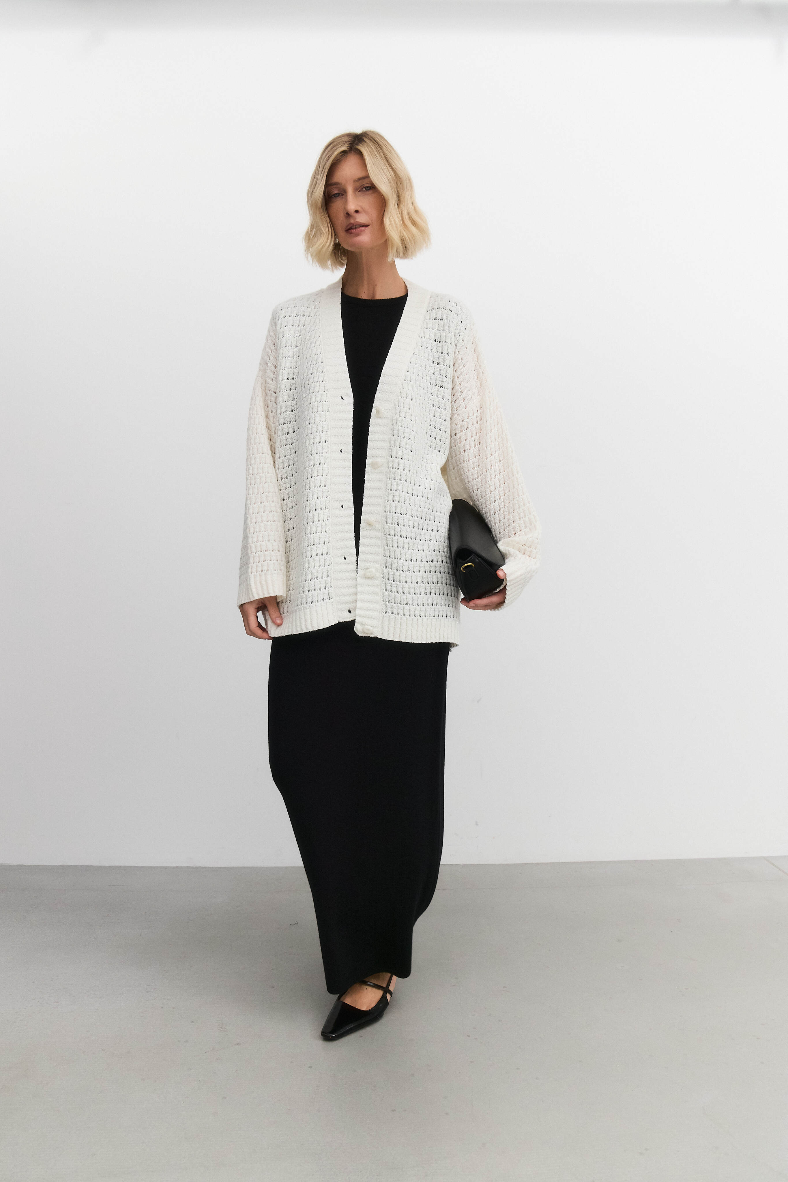 Ажурный кардиган из мохера с пайетками — это изысканный элемент гардероба, который сочетает в себе нежность, элегантность и современный шик. Такой кардиган идеально подходит для создания разнообразных образов — от повседневных до вечерних.