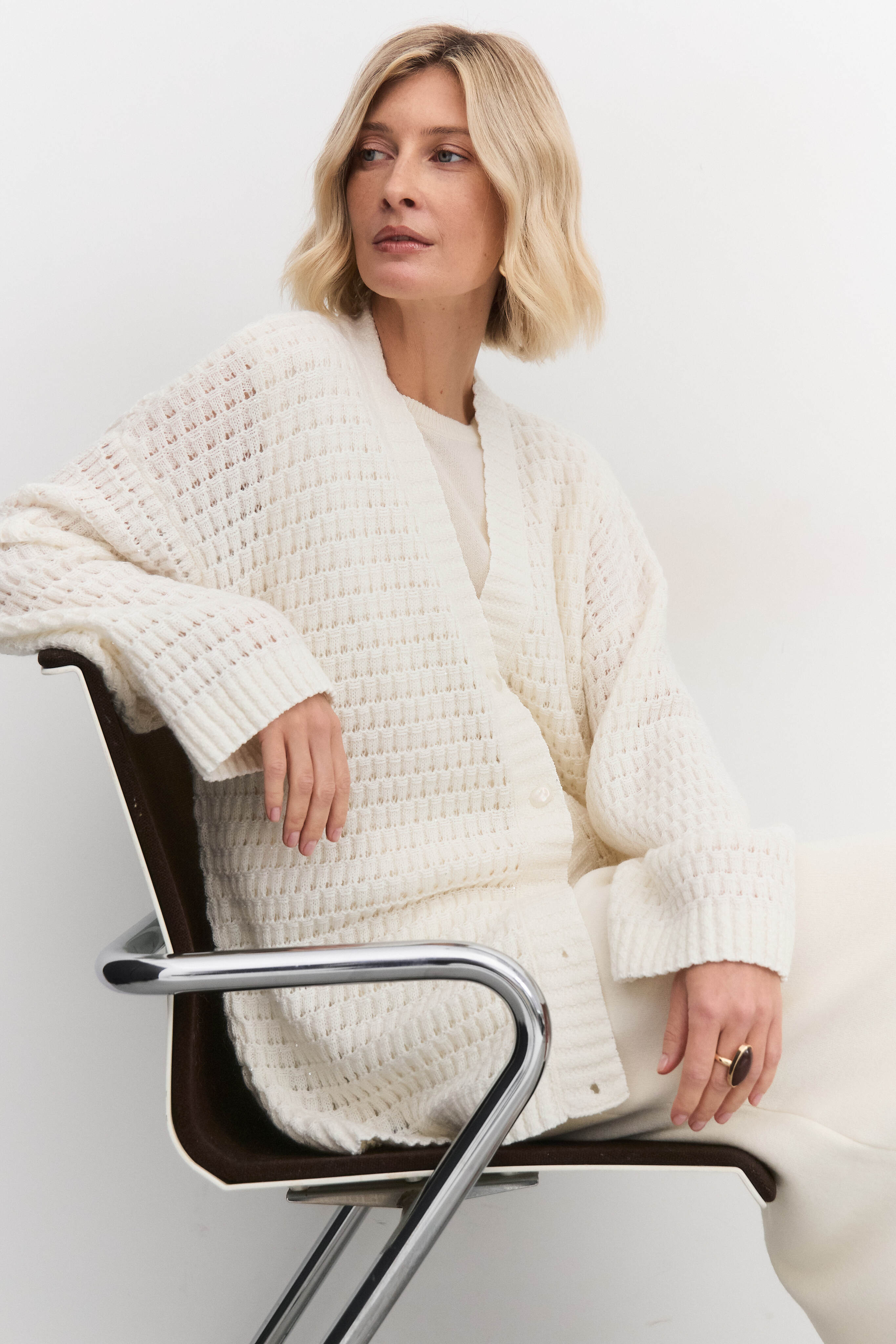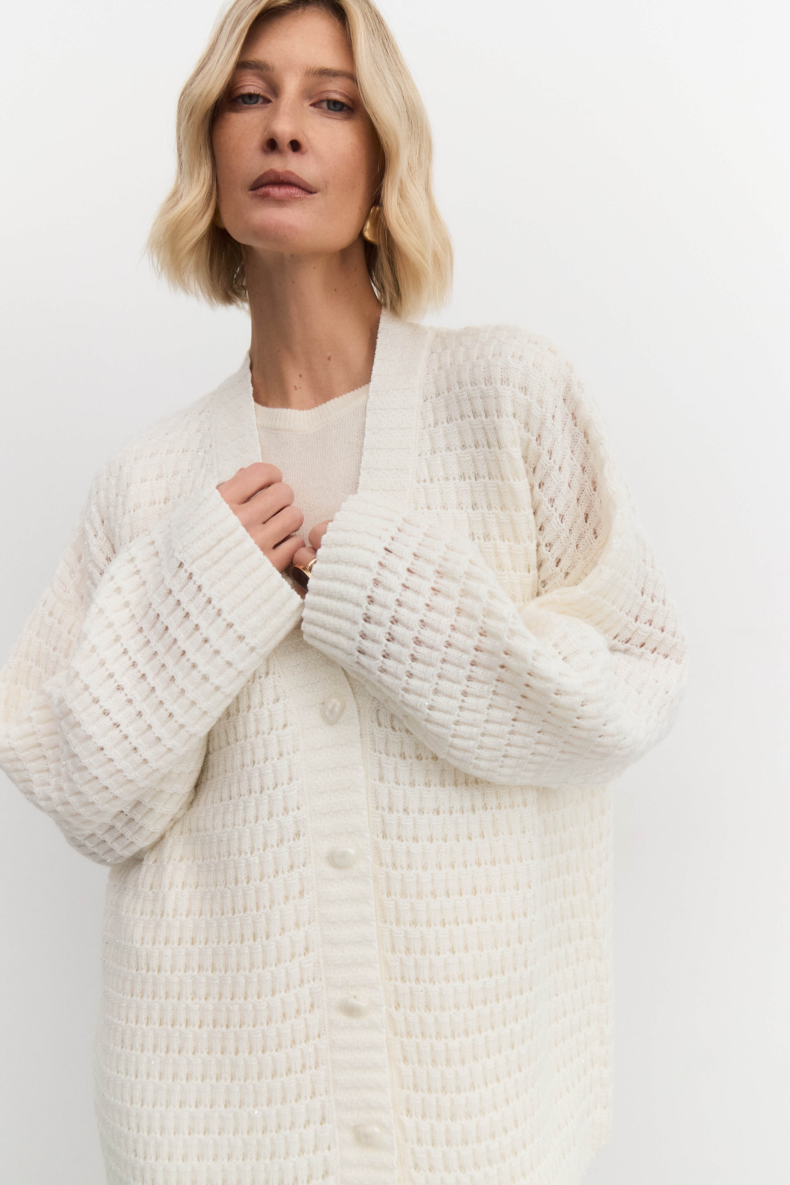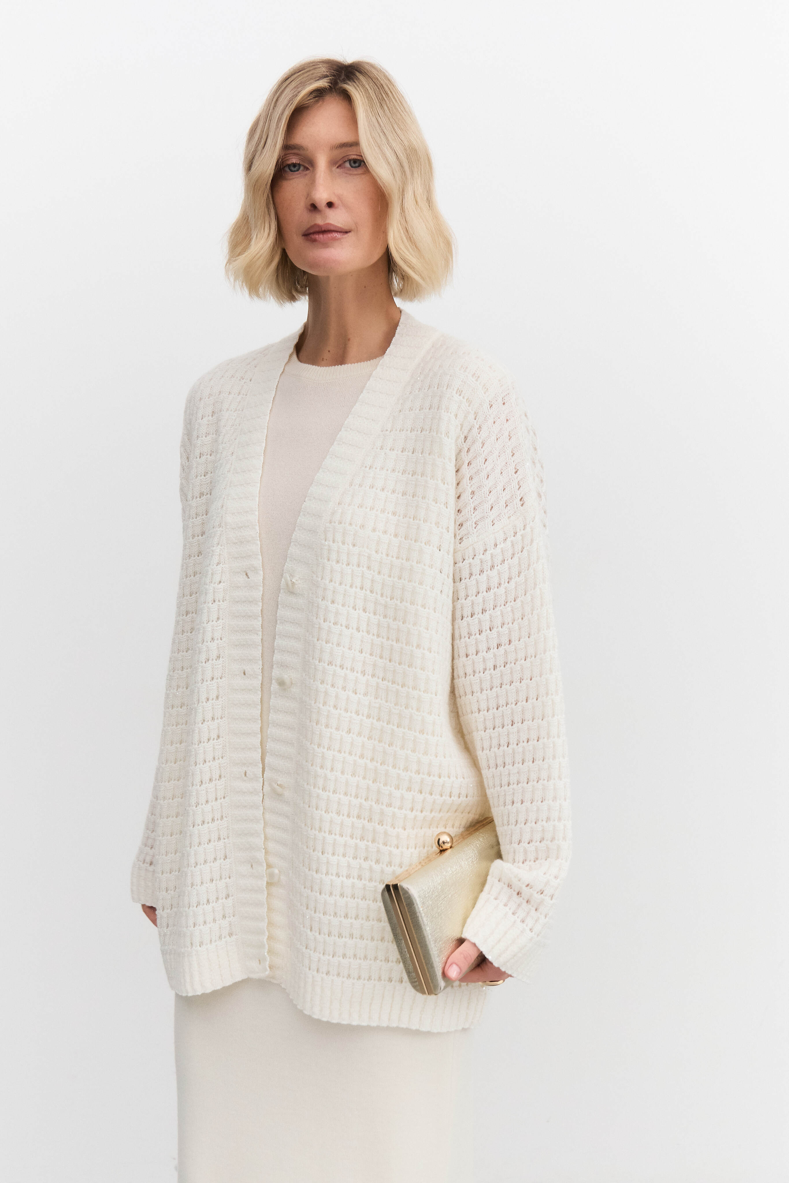 Кардиган связан из мягкой пряжи с содержанием мохера, что придает ему легкость и тепло. Добавление пайеток создает мерцающий эффект, делая изделие праздничным и привлекательным. Ажурная модель добавляет образу женственности и воздушности, имеет свободный крой, дополнена пуговицами.