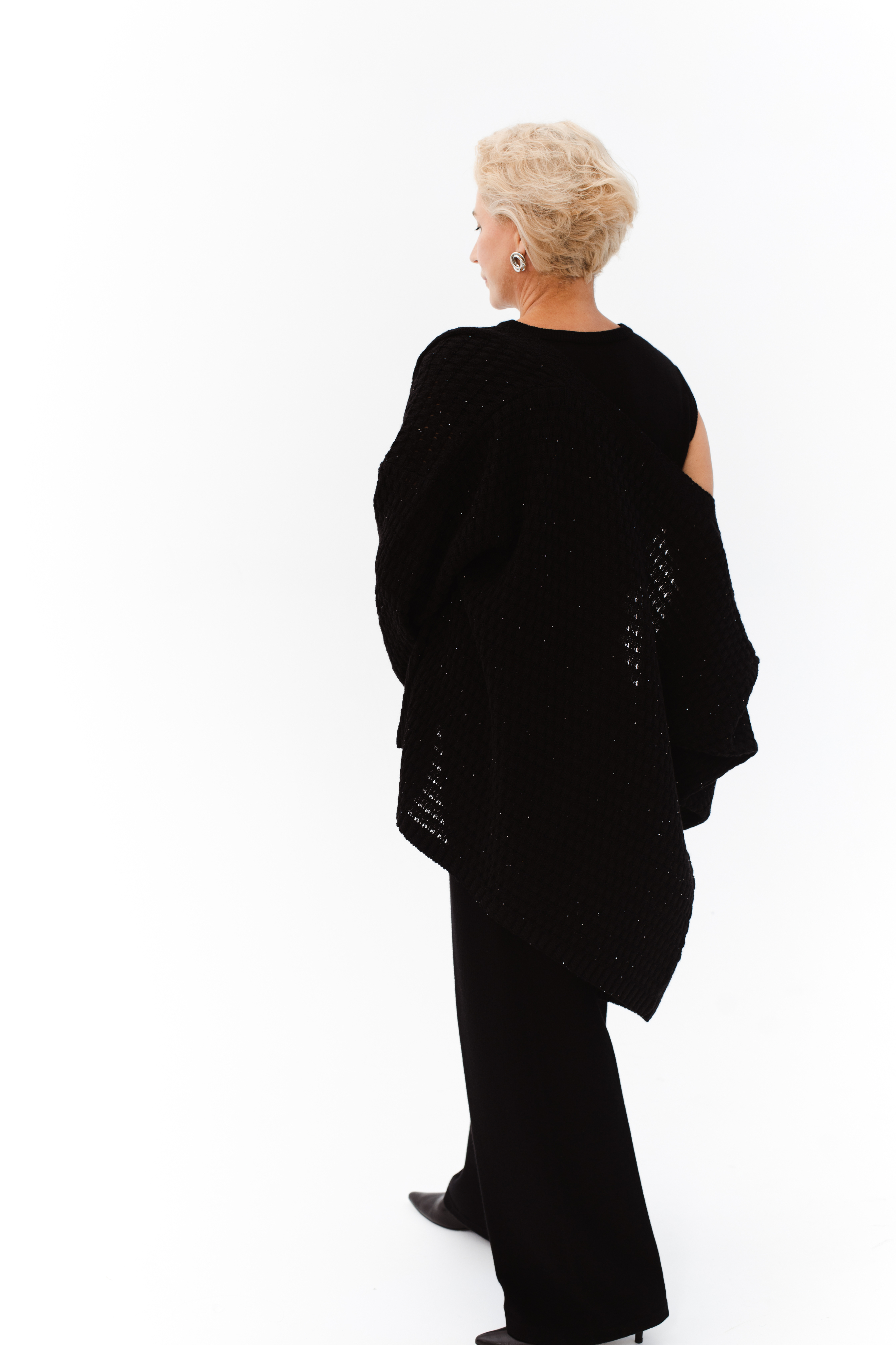 Кардиган связан из мягкой пряжи с содержанием мохера, что придает ему легкость и тепло. Добавление пайеток создает мерцающий эффект, делая изделие праздничным и привлекательным. Ажурная модель добавляет образу женственности и воздушности, имеет свободный крой, дополнена пуговицами.