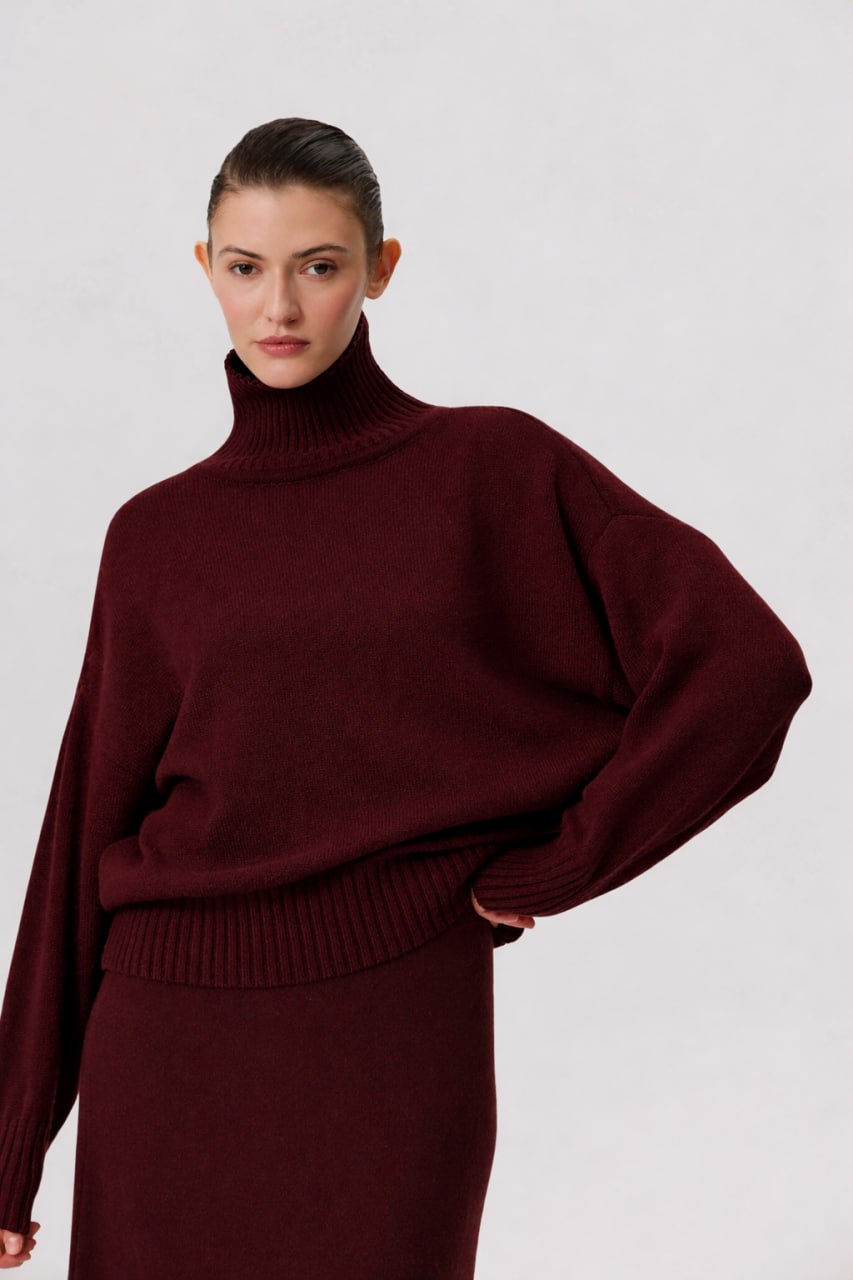 Свитер свободного силуэта с высоким горлом, манжетами и резинкой по низу. Связан из нежной шерсти кашемира с шерстью в две нити, благодаря чему изделие получилось объемным, но мягким и легким.