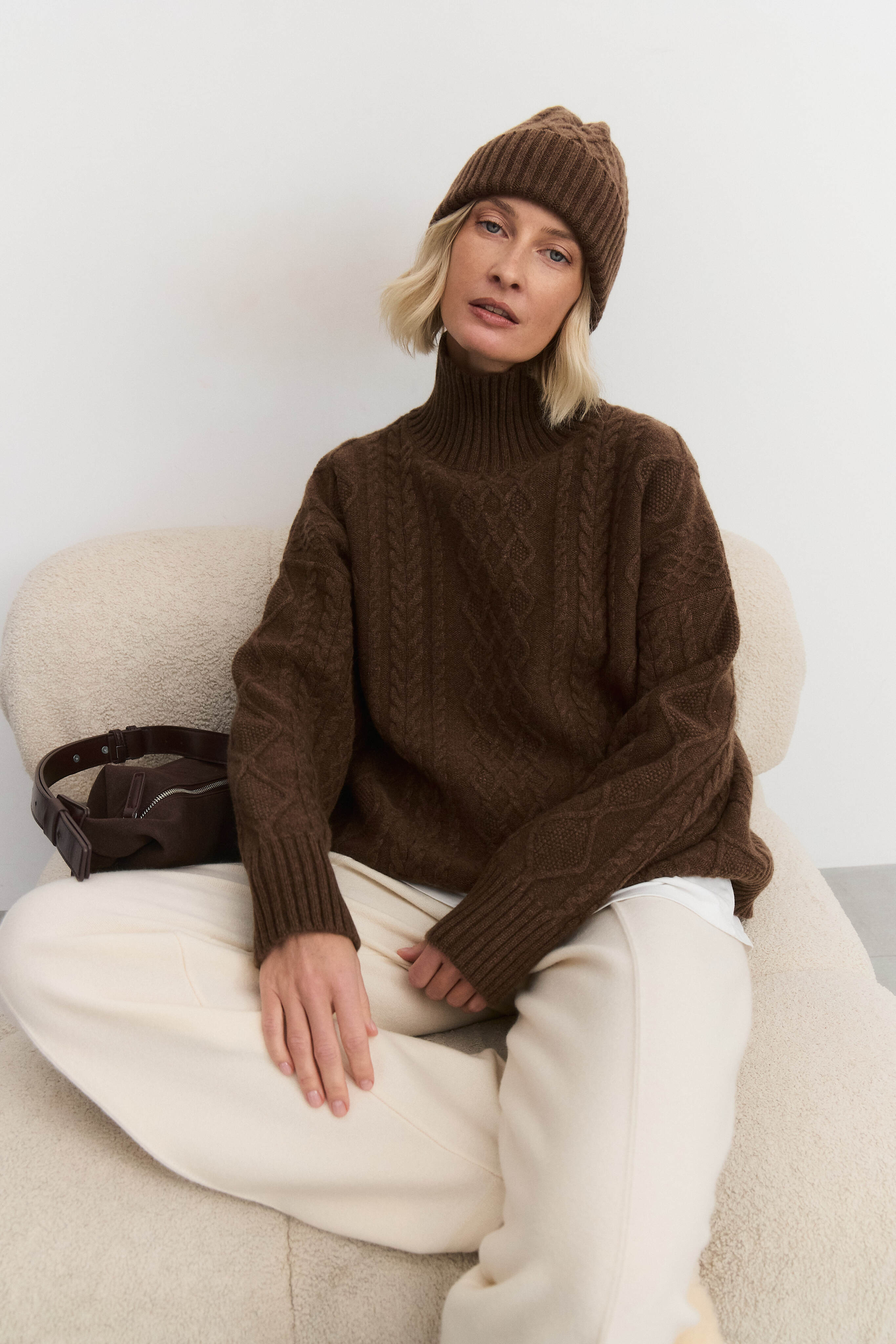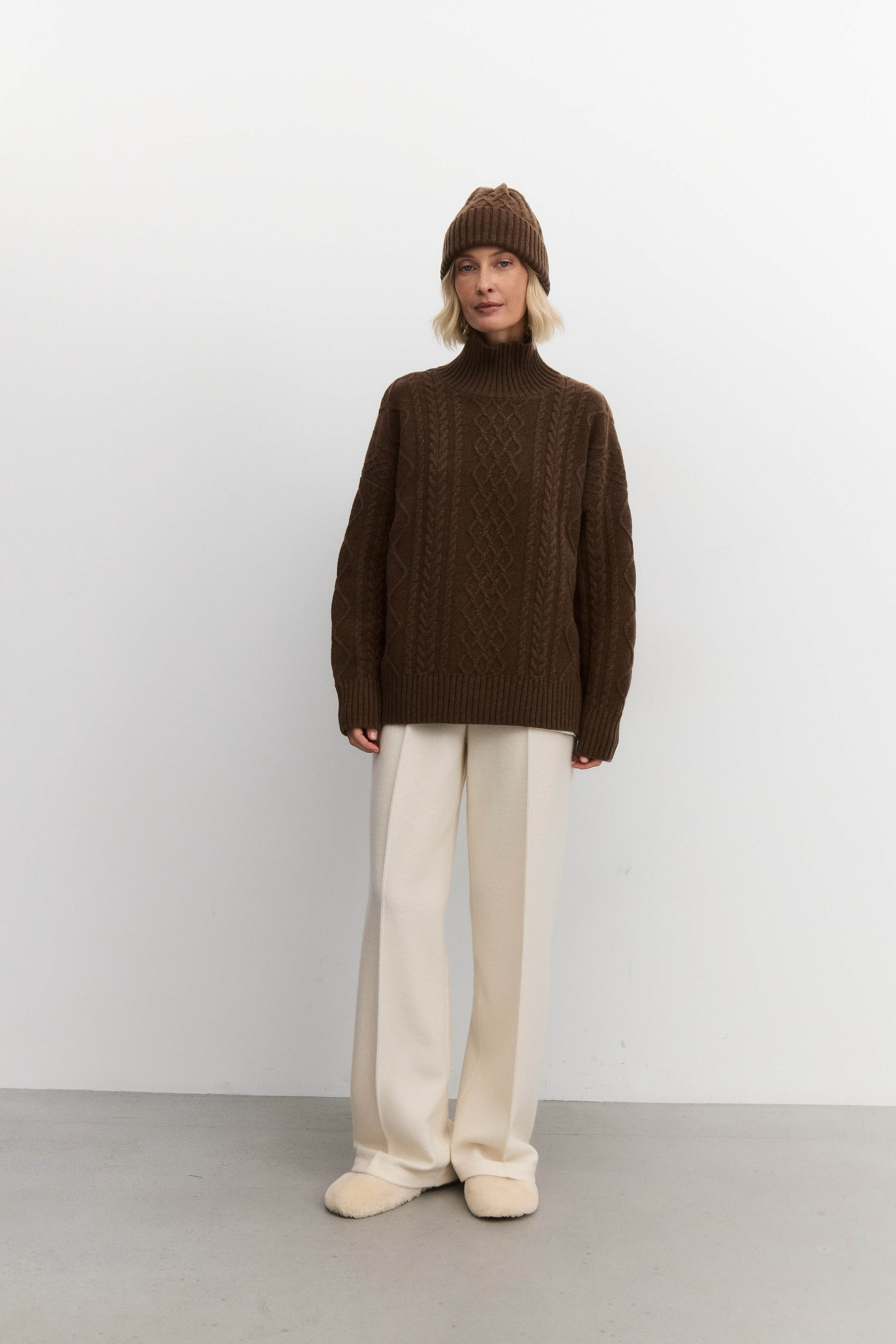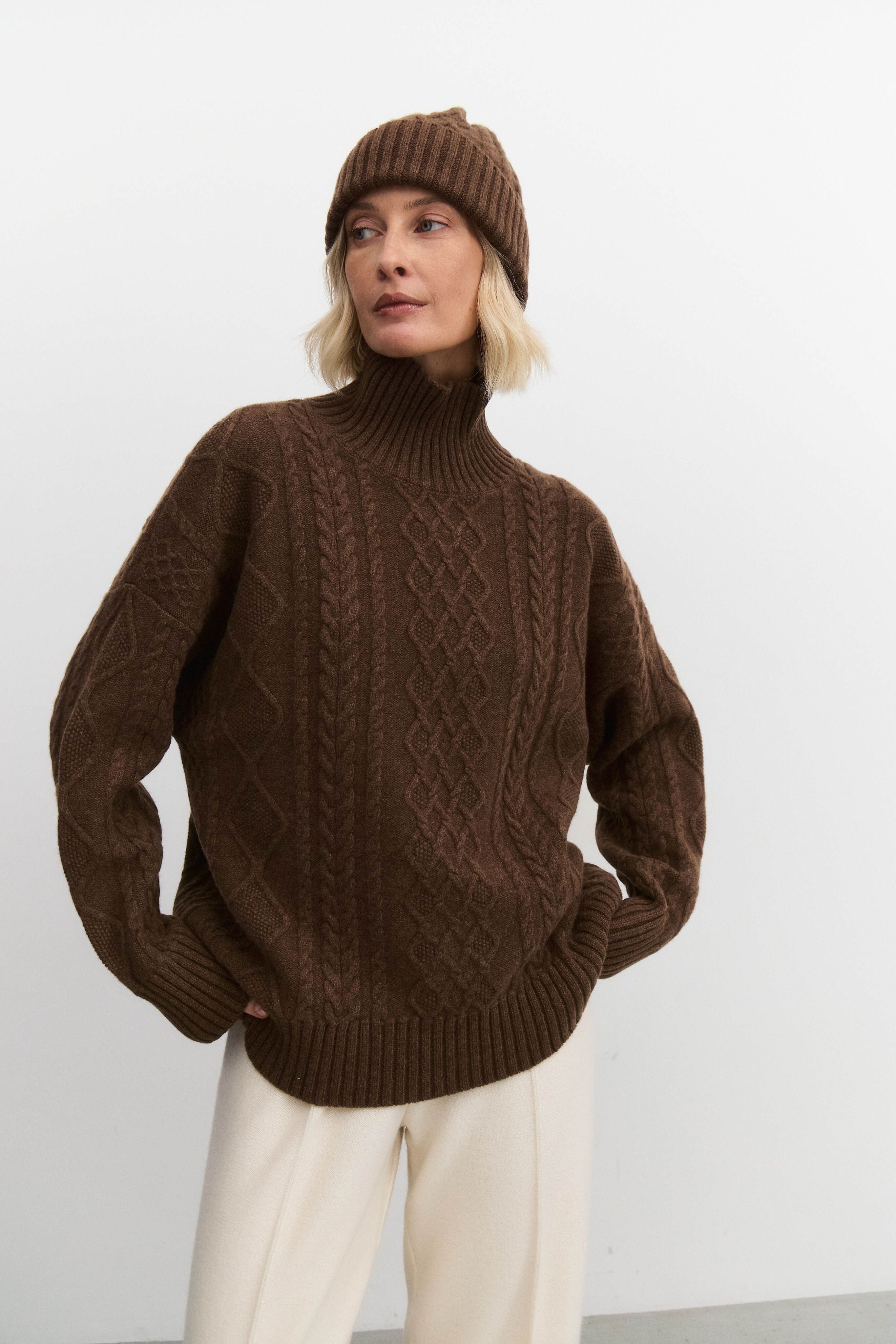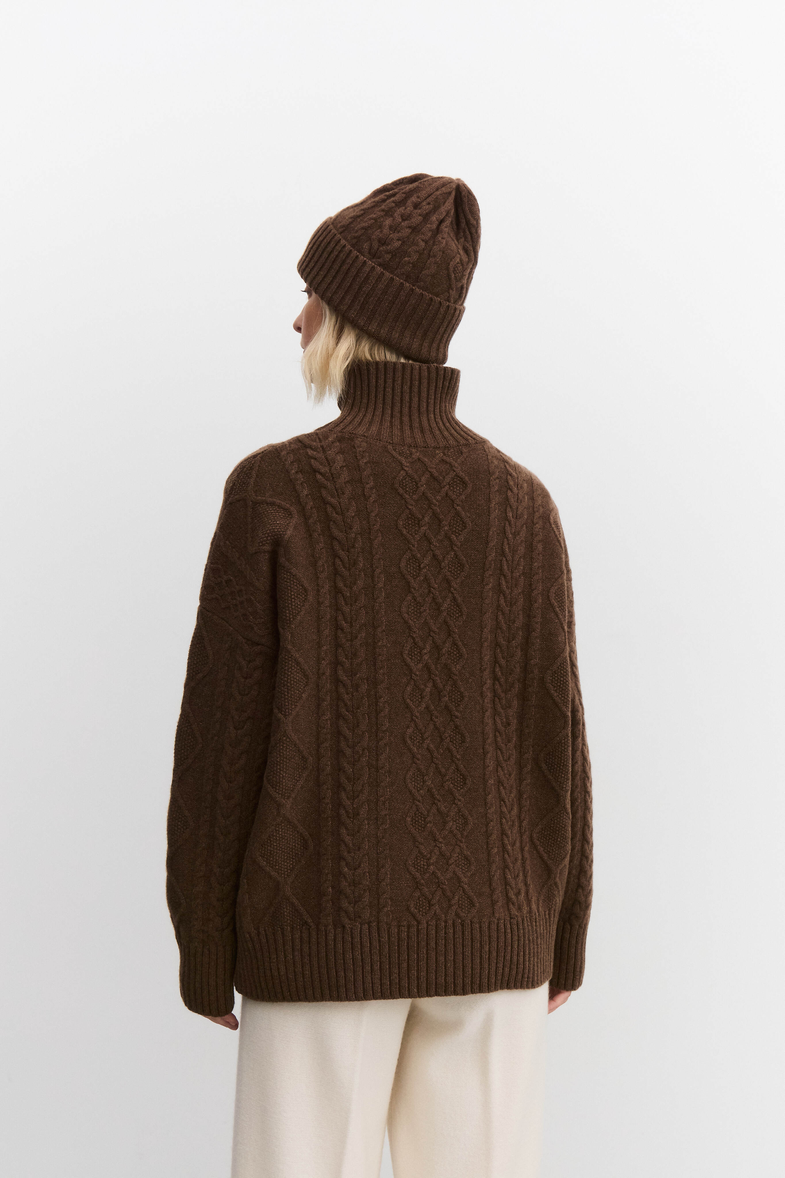 Фактурный, объемный, удлиненный и мягкий свитер с арановыми узорами и высоким горлом. Выполнен из премиальной мериносовой шерсти с кашемиром, что делает его необычайно мягким и комфортным.
