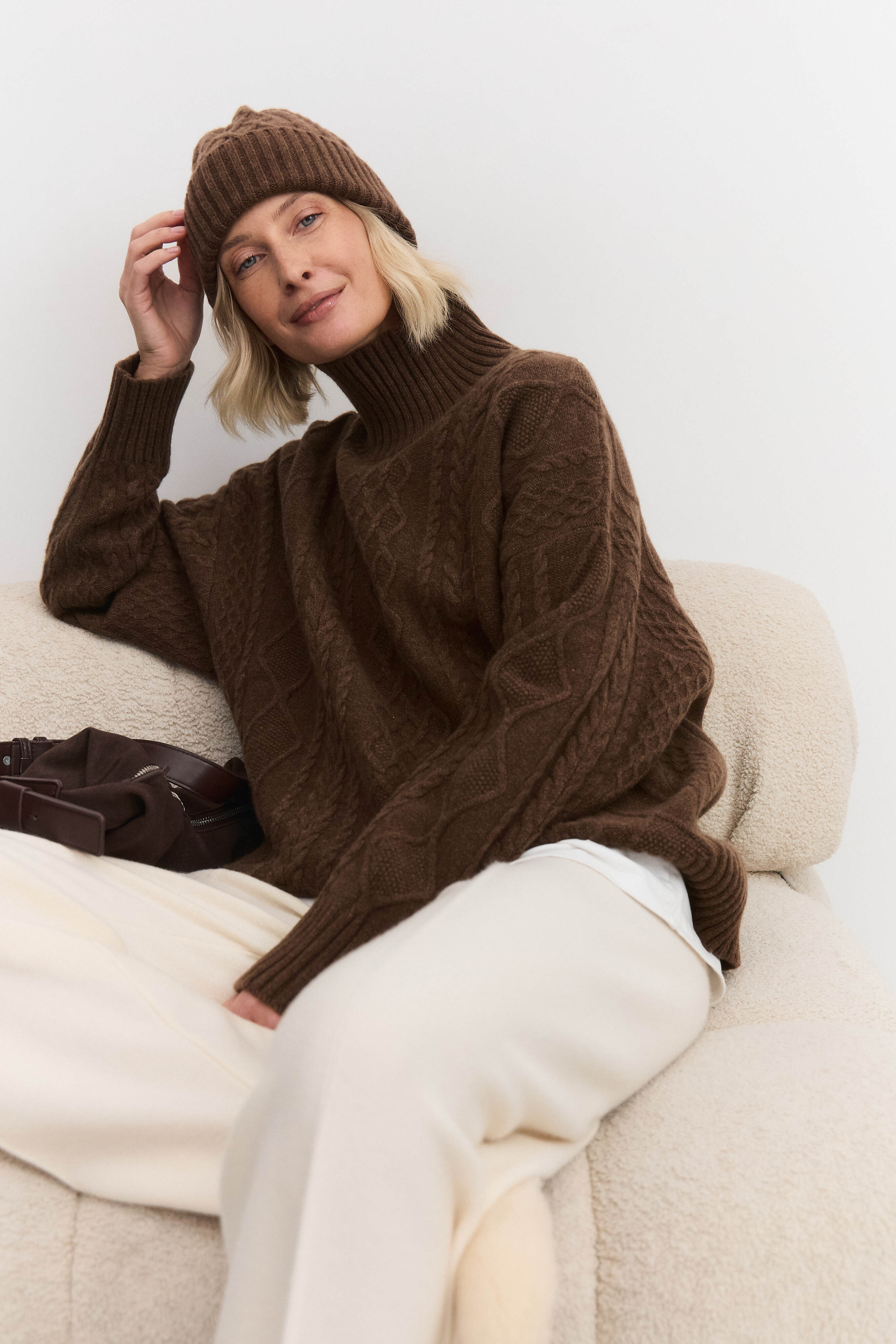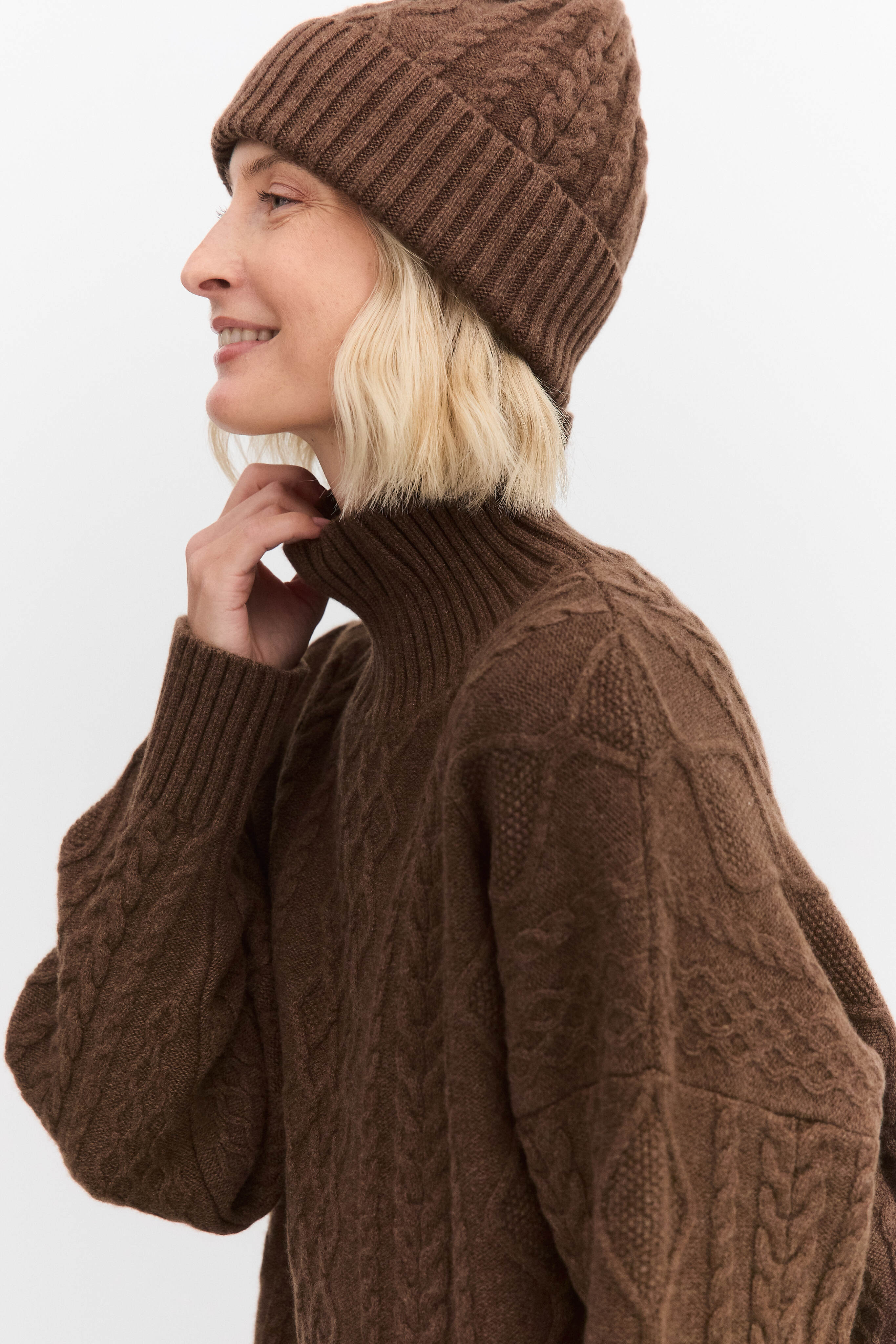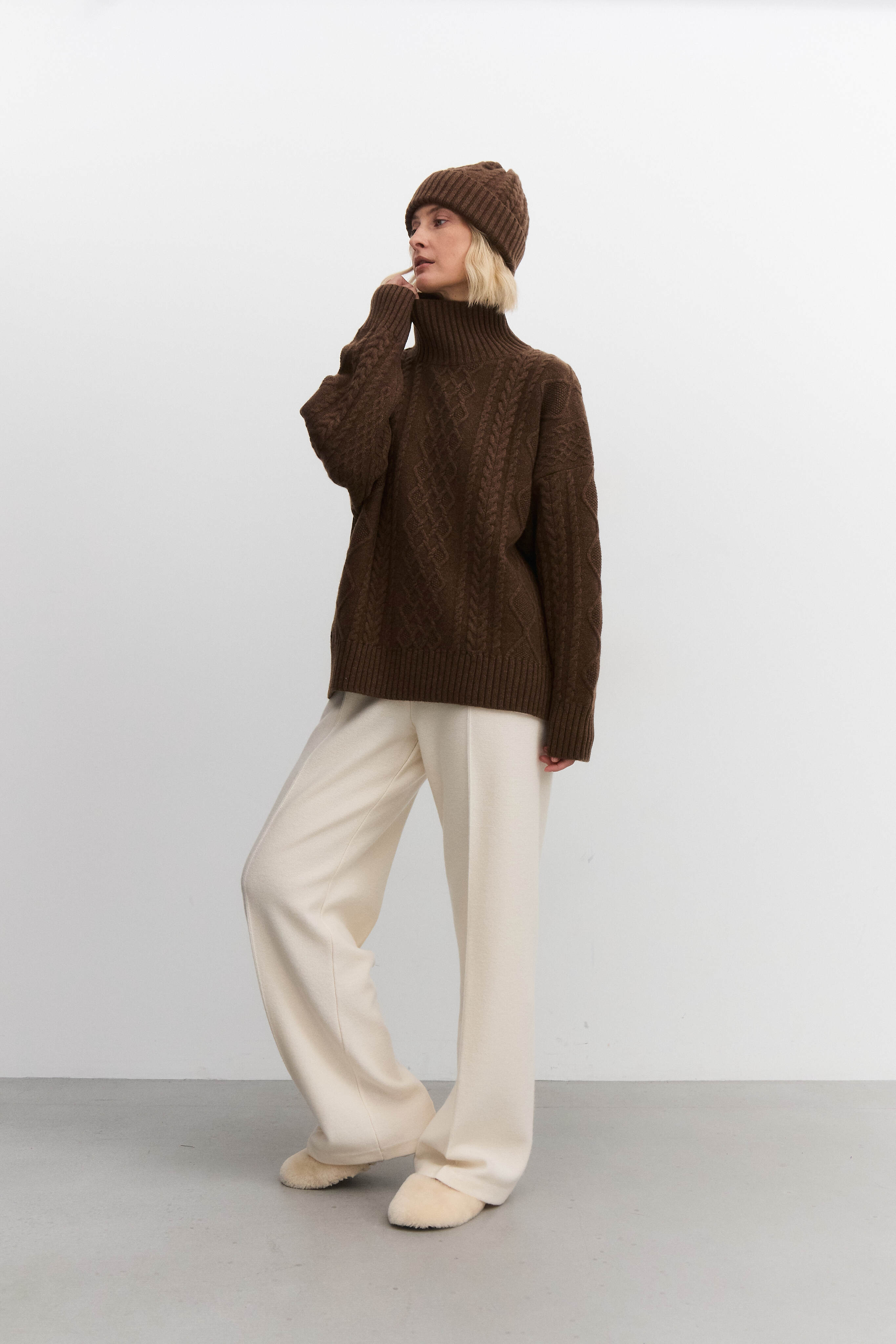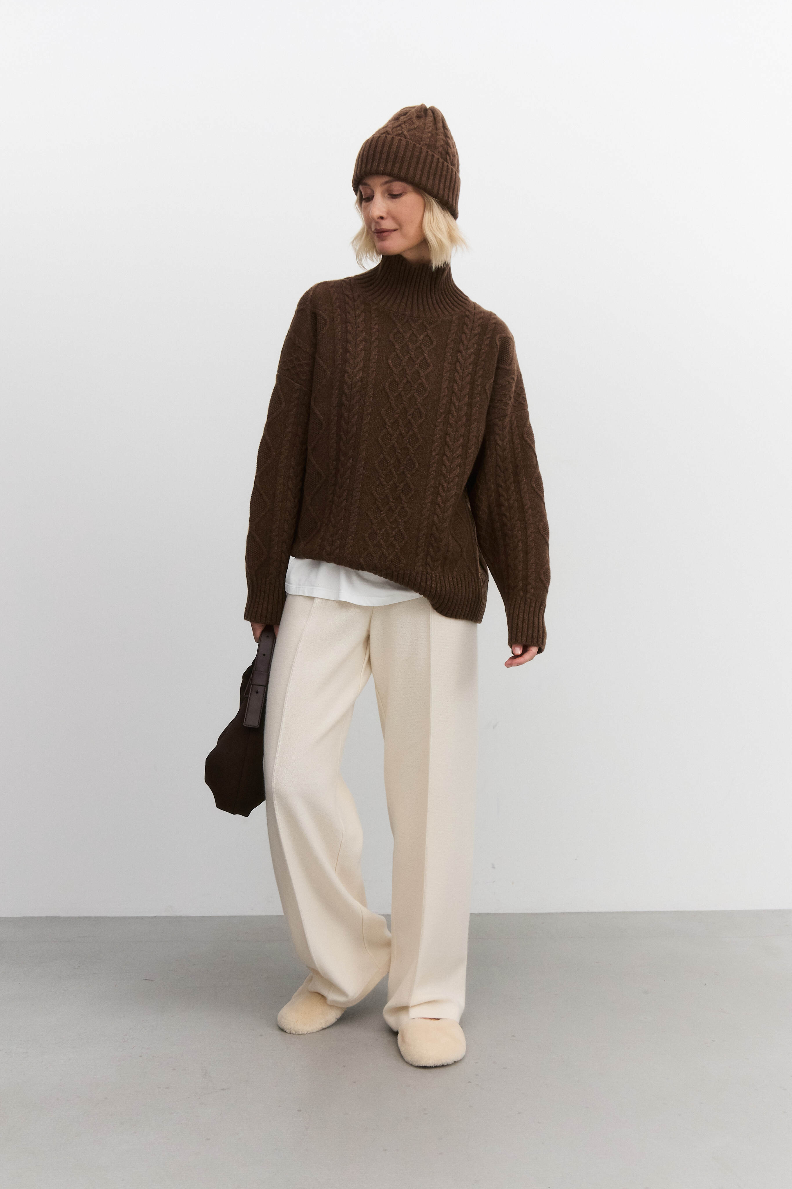 Фактурный, объемный, удлиненный и мягкий свитер с арановыми узорами и высоким горлом. Выполнен из премиальной мериносовой шерсти с кашемиром, что делает его необычайно мягким и комфортным.